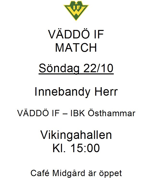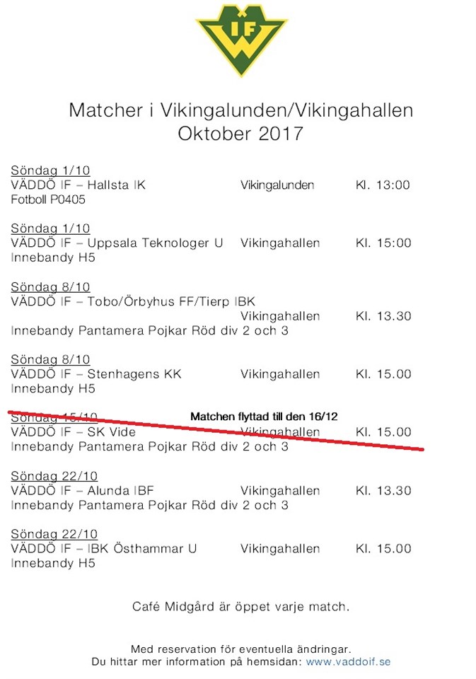 Beklagar tidigare missförstånd, detta är de matcher som gäller. Med reservation för eventuella ändringar förstås. VÄDDÖ IF 19 okt 2017 0kommentarer