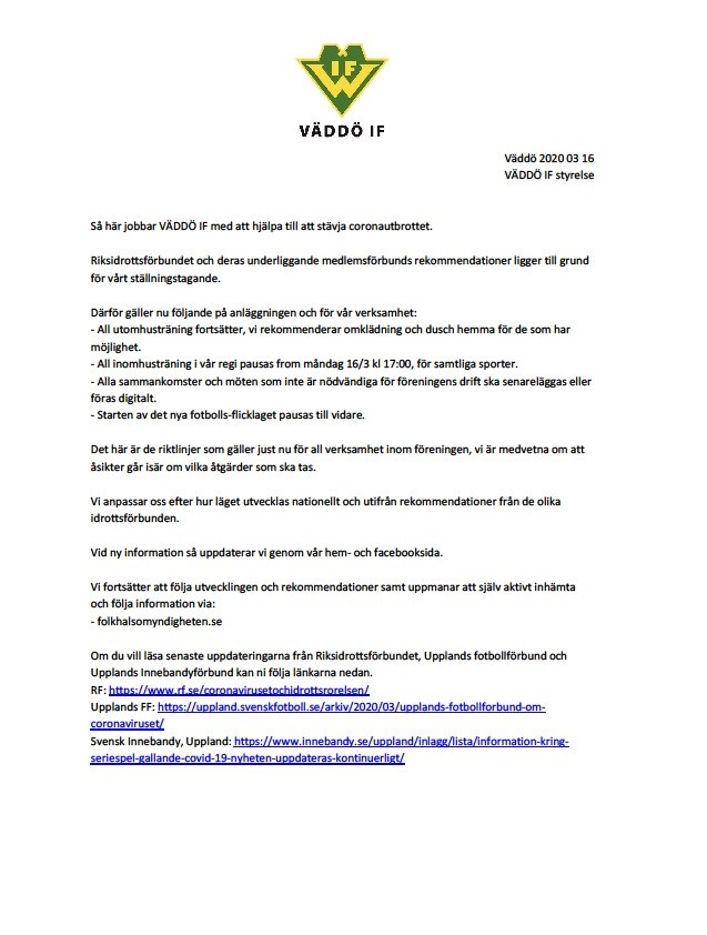 Viktig information. VÄDDÖ IF 16 mar 2020 2kommentarer