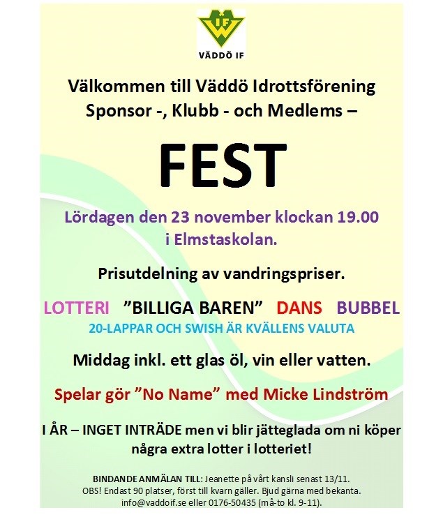 Du har väl inte missat inbjudan. Vi vill påminna om att det imorgon är sista anmälningsdagen till FESTEN för DU kommer väl? Du kan anmäla dig på vår facebooksida också! VÄDDÖ IF 12 nov 2019 0kommentarer