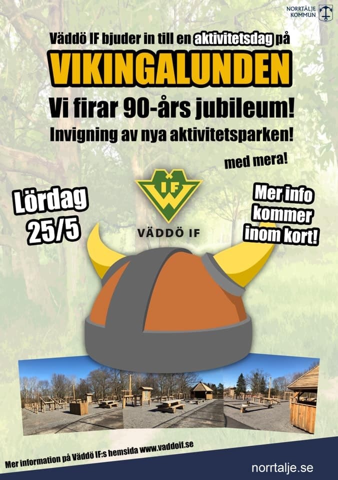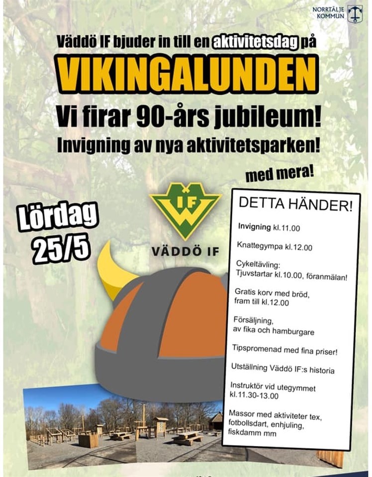 I samband med att Väddö IF firar 90 år och invigningen av aktivitetsparken på Vikingalunden lördagen den 25/5 så kommer det förutom alla roliga aktiviteter på området att anordnas ett cykellopp! Är du riktigt tävlingsinbiten, älskar att cykla, gillar att motionera, röra på dig eller bara vill göra en kul sak? Har du en riktig racer till cykel, en militärcykel, en trehjuling eller en rostig gammal trotjänare? Känn dig mer än välkommen att delta. Kanske anmäler du och ditt företag, idrottslag, kompisgäng eller du och din partner ett lag. Tävlingen är öppen för alla (både barn och vuxna) och priser kommer att delas ut både efter resultat, kämpainsats och glädje. Kanske skänker du glädje genom att klä ut dig till något? Tävlingen som startar kl 10:00 körs i en slinga förbi Vikingalunden och runt Hammarby och underlaget består både av asfalt och grus. Tävlingen är en lagtävling med lag bestående av två eller flera deltagare. Men skulle man inte ha något lag så är man självklart välkommen att tävla själv ändå. Vinner gör det lag/deltagare som har cyklat flest varv under tävlingstiden som är satt till tre timmar. Det kommer att finnas en växlingsstation där lagen växlar förare så ofta de vill, vare sig det är varannat varv eller fem varv i taget. Självklart måste alla deltagare använda cykelhjälm. Deltagandet kostar 100:- per vuxen och 50:- per barn och i detta ingår ett tävlingskit med mellanmål och dryck. Anmälan görs via info@vaddoif.se, meddelande i messenger via Väddö IF:s facebooksida eller på telefonnummer 017650435 eller 0736156529. Vid anmälan anges lagets namn, kontaktperson och namn på lagets deltagare. I samband med anmälan betalas också deltagaravgiften via swish till 1236826713 (WIF Café). Lag betalas i en betalning och märk betalningen med ”Cykeltävling +lagnamn/deltagarnamn”. Kan man inte lösa detta via swish så kan man ta kontakt enligt ovan så ska det gå att ordna. Anmälan kan göras fram till och med onsdag 22/5. Varmt välkomna att vara med! Det blir kul!