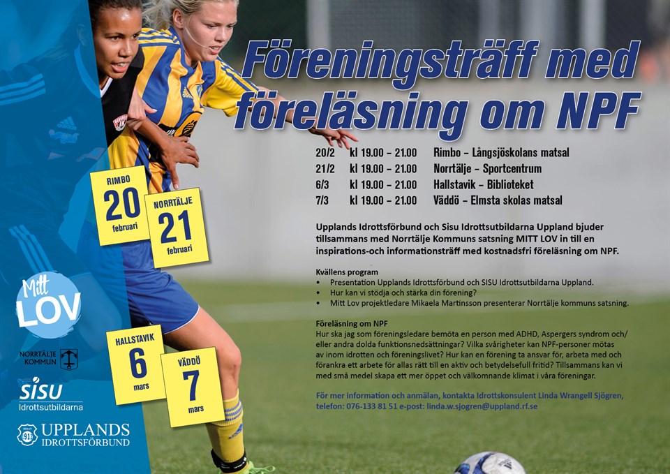 Hej Upplands Idrottsförbund och SISU Idrottsutbildarna Uppland tillsammans med Norrtälje Kommun bjuder härmed in till föreningsträff och vi hoppas såklart att just du och din förening kommer! Kommunen är stor - därför erbjuder vi träffarna vid 4 tillfällen och på 4 av kommunens orter - Rimbo, Norrtälje, Hallstavik och Väddö. Välj den ort och det datum som passar dig bäst. Syftet med föreningsträffen är: - att informera om Upplands Idrottsförbund, SISU Idrottsutbildarna samt hur jag (Linda Wrangell Sjögren) i min roll som Idrottskonsulent kan stödja din förening i allt från processarbeten till utbildning/bildningsinsatser. - att informera om Norrtälje kommuns satsning MITT LOV. Mikaela Martinsson projektledare för satsningen delar med sig av tankarna bakom projektet, vad det innebär för er som förening om hur ni kan vara med och marknadsföra just er förening genom dessa lovaktiviteter. Vi bjuder på en kostnadsfri föreläsning om NPF - Neuropsykiatriska Funktionsnedsättningar. Ta del av programmet samt läs mer om Mitt lov i bifogade dokument. Ledare, styrelse, anställda och föräldrar är välkomna. För frågor kontakta Linda Wrangell Sjögren tel: 076 -133 81 51 e-post: linda.w.sjogren@uppland.rf.se eller Mikaela Martinsson tel: 073-558 21 31 e-post: mikaela.martinsson@norrtalje.se Anmälan via dessa länkar: Rimbo : http://www.sisuidrottsutbildarna.se/Distrikt/SISUIUUppland/varautbildningar/varakurserochutbildningar/?eventid=1091060&sisuorgid=28570 Norrtälje: http://www.sisuidrottsutbildarna.se/Distrikt/SISUIUUppland/varautbildningar/varakurserochutbildningar/?eventid=1091148&sisuorgid=28570 Hallstavik: http://www.sisuidrottsutbildarna.se/Distrikt/SISUIUUppland/varautbildningar/varakurserochutbildningar/?eventid=1091152&sisuorgid=28570 Väddö: http://www.sisuidrottsutbildarna.se/Distrikt/SISUIUUppland/varautbildningar/varakurserochutbildningar/?eventid=1091154&sisuorgid=28570 Varmt välkommen! / Linda och Mikaela VÄDDÖ IF 13 feb 2018 0kommentarer