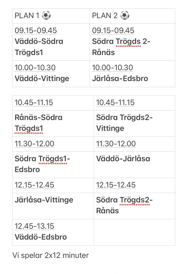 Ursäkta dålig information för helgen. Men det har varit jätterörigt med lag som inte svarat och som svarar sent mm. Jag lägger ut spelschemat här. Kioskschemat kommer imorgon. Vi förväntar oss att minst en förälder för varje barn som är anmäld kommer att hjälpa till. Nu under kvällen fick vi även ihop 2 st domare, äntligen! Fråga om ni undrar något! Vårat lags barn får gratis hamburgare. Vi samlas senast 08:15, försöker hjälpas åt med det sista som behövs göras tex göra ordning dom två planerna vi använder och göra ordning kiosken. FB P-1516 31 aug 2023 0kommentarer
