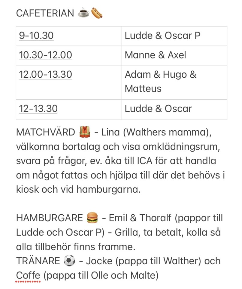 Enligt önskemål från annat lag spelar vi 2x15 istället för 2x12. Det står inte i schemat men gör ingen skillnad. Vi samlas och hjälps åt att ställa iordning i cafeterian, dra fram fotbollsmål, avbytarbänkar, ta fram grill osv. Kioskschemat är ”på ett ungefär”, byt tid med varandra om ni vill och ta hjälp av varandra. Detta är helt nytt för oss alla! Ser ni att det är kaos i kiosken så kolla om dom vill ha hjälp. Och våga be om hjälp såklart! Vi är ett bra gäng och hjälps vi åt så blir det här kanon. Allt som säljs i cafeterian går till Väddö IF och betalas med Swish till deras nummer. Hamburgarna däremot är köpta för lagets pengar och betalas till lagets egna swish. Det betalar man ute vid burgarna. Barnen ur vårt lag får gratis hamburgare, Jocke och Coffe fixar så att dom äter när det är ”lång paus”. Dricka kan vi också fixa, vi betalar Väddö If sen från vår lagkassa. FB P-1516 1 sep 2023 3kommentarer
