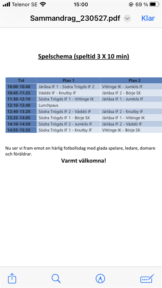 Hej! Nu har vi fått information från Järlåsa här. Väddö IF har matchställ till alla (strumpor, shorts, tröja). Ta med egen vattenflaska. Glöm inte att svara om ni kommer eller inte. Vi väntar på Olle, Malte, Ellie och Stella. Bifogar spelschema. Från Järlåsa: Välkomna till Järlåsa för sammandrag Mix 8 år På lördag den 27 maj är det dags för sammandrag för Mix 8 år och denna gång är ni varmt välkomna till oss i Järlåsa och Järvallens IP. Vi kommer att starta dagen kl. 09.30 med en ledar- och domarträff. Matcherna startar 10.00 och beräknar vara klara till kl. ca 15:35. Vi har 9 deltagande lag och spelar på två gräsplaner. Det finns möjlighet till delat omklädningsrum. Försäljning av korv, hamburgare, dryck med mera kommer att finnas i direkt anslutning till planerna. Kontaktperson för Järlåsa: Emma Källvik 070 732 64 24 Parkering finns vid direkt anslutning till Järvallen